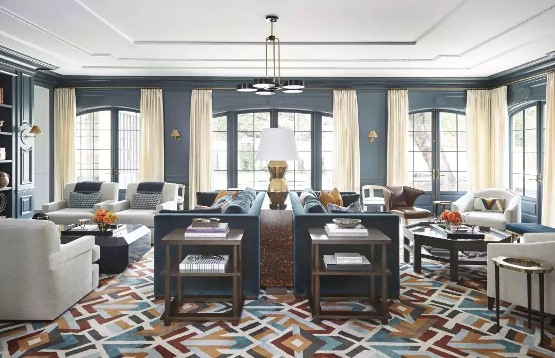 彩色地毯是房間的焦點,以此獲得更具凝聚力的外觀。而房間墻面采用了灰藍色,在它的暈染之下,整個空間呈現著異想天開般的浪漫與優雅。清俊秀雅的孔雀藍作為過渡裝飾色被使用在沙發、地毯、座椅等布藝上,大面積填充其中,將高雅的韻味加以強調。杏仁色與磚紅色作為補充,二者的加入無疑為空間增色不少,強有力的展現著悅動的氣質。