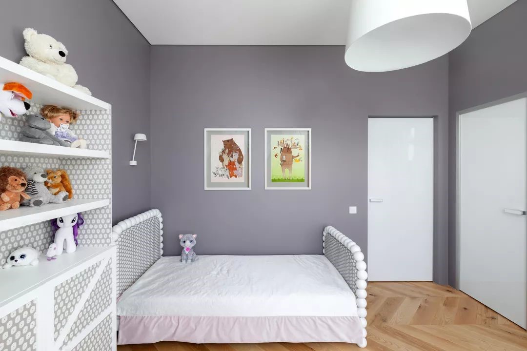 經典高級灰打造出來的簡約兒童房空間,太妃糖地板,菠菜綠掛畫,探戈橘色點綴畫架,為空間注入了童趣意味和悅動的的親切與溫柔。