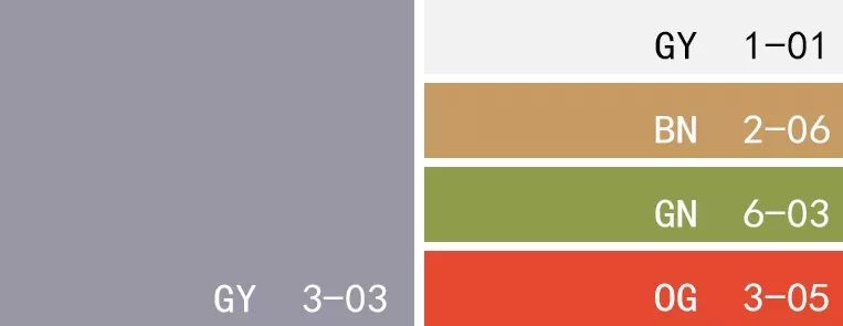 —丁香灰+亮白色+太妃糖色+菠菜綠+探戈橘色——