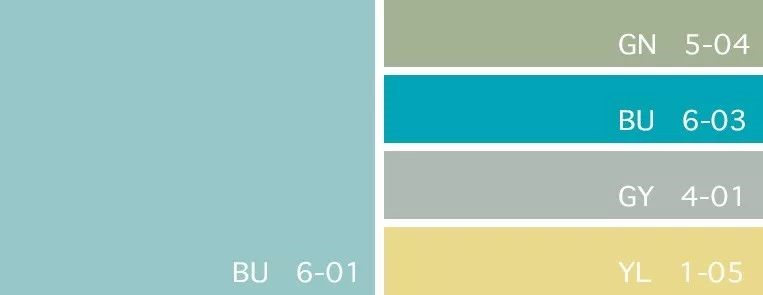——淺松石、灰綠色、淺孔雀藍、冰川灰、奶黃色——