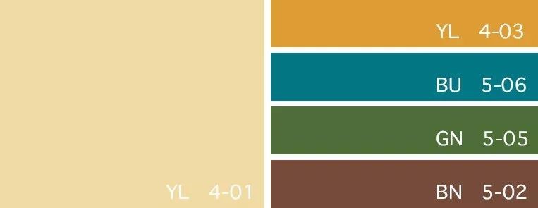 ——陽光色、金色、比斯開灣藍、樹梢綠、玳瑁色——