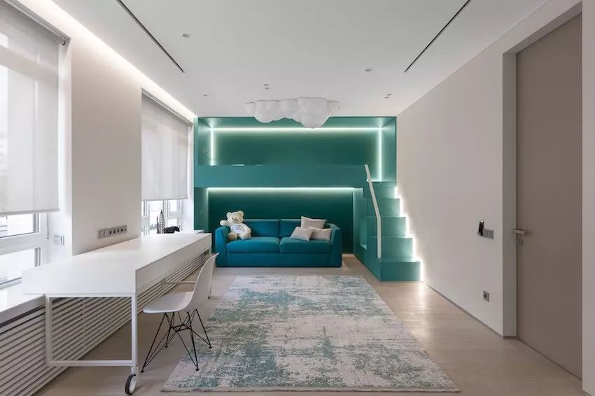 ——小孩房中以清爽白作為空間基調(diào),臥眠區(qū)以森林綠打造兼具收納功能的爬梯床。