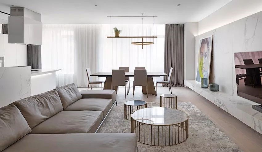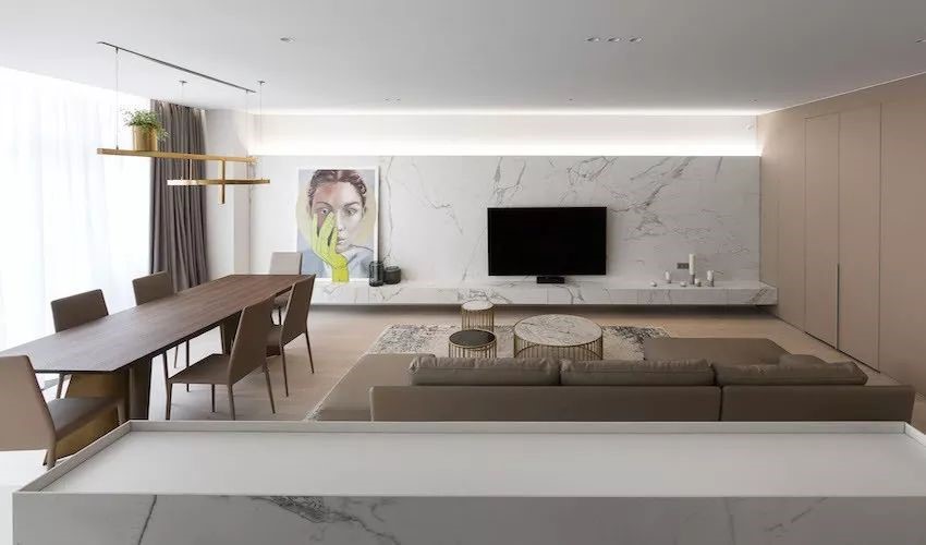 ——整面深長的大理石電視墻串連起一氣呵成的動線,大面積落地玻璃窗引入充沛光感。
