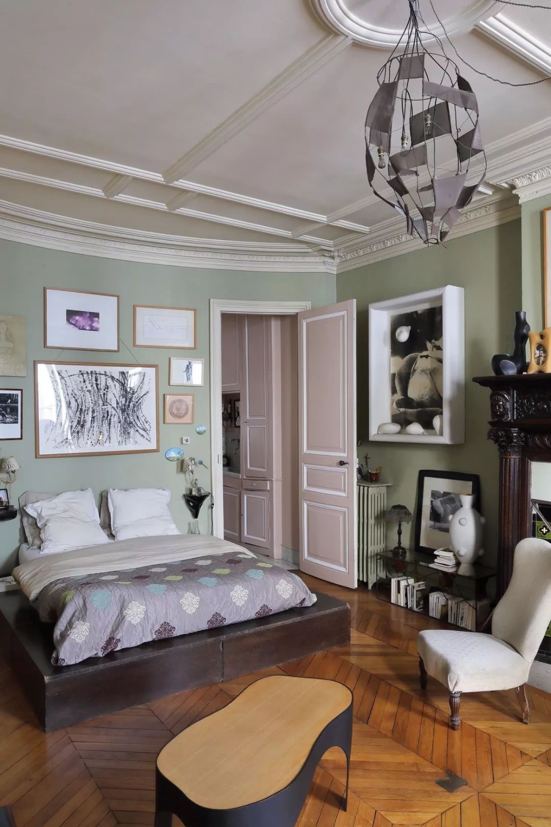 ——這間臥室中,灰綠色與裝飾藝術(shù)的有機(jī)形式結(jié)合在一起,創(chuàng)造出一個(gè)極具現(xiàn)代藝術(shù)性的空間。