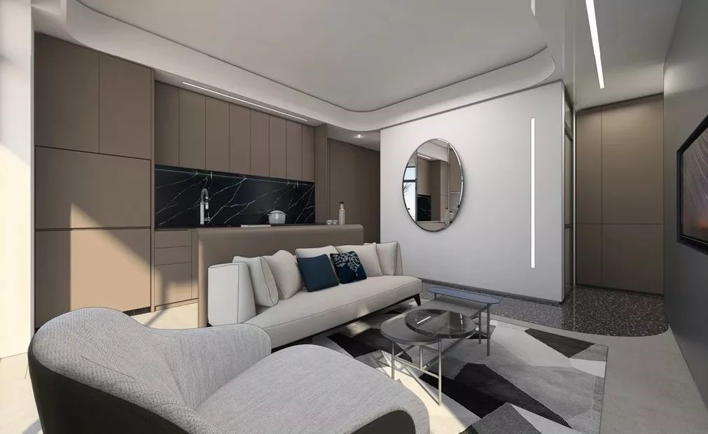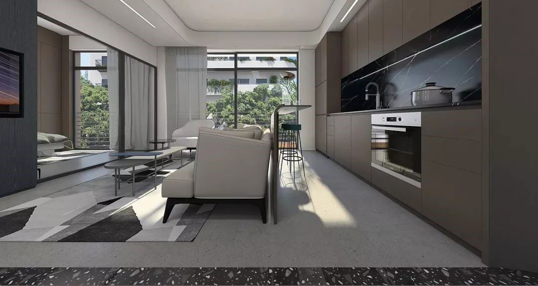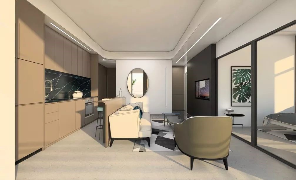 ——廚房與餐廳、客廳充足的光線增添了整體空間區域的舒適性柜體都使用了灰棕色材質進行空間的