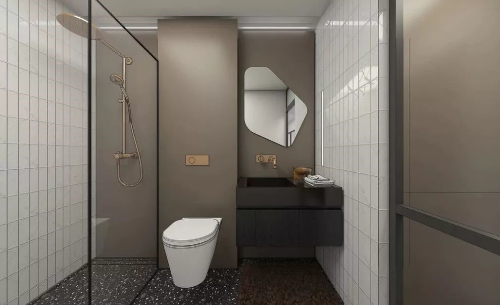 ——安裝了玫瑰金淋浴配件,點綴整個空間高級感,坐便器與洗手臺,不規則形狀鏡面產生空間延