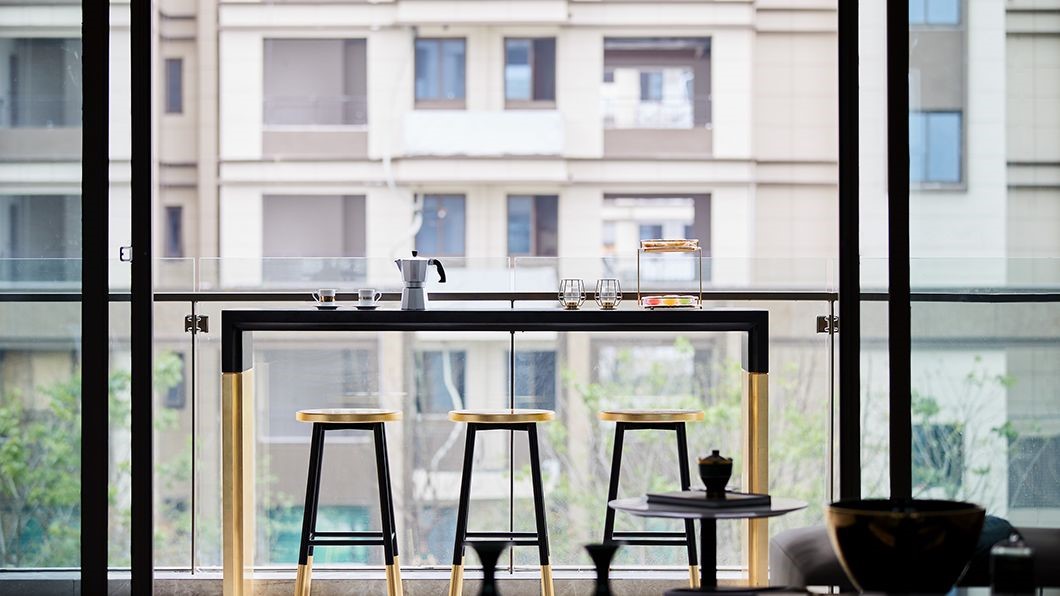 觀景陽臺是客廳向室外的延伸,以實木和金箔打造吧臺區,精致與休閑感并存,于此盡攬戶外風光,頗有“鬧中取靜”、“忙里偷閑”之態。