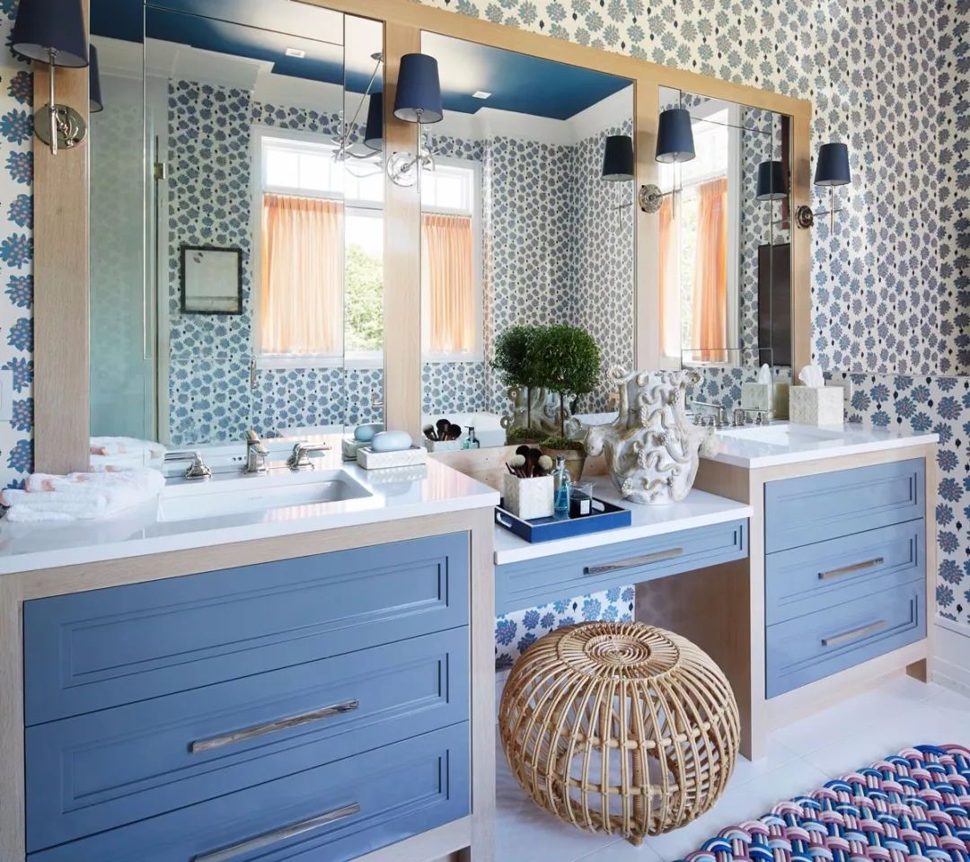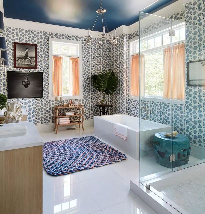——這間浴室既異想天開又充滿風采,定制色彩“Ikat Blossom”壁紙讓墻壁呈現出學院風。為創造一個更佳舒適的空間,采用了深藍色油漆裝飾了高聳的天花板。一切都是相輔相成又極具特色。