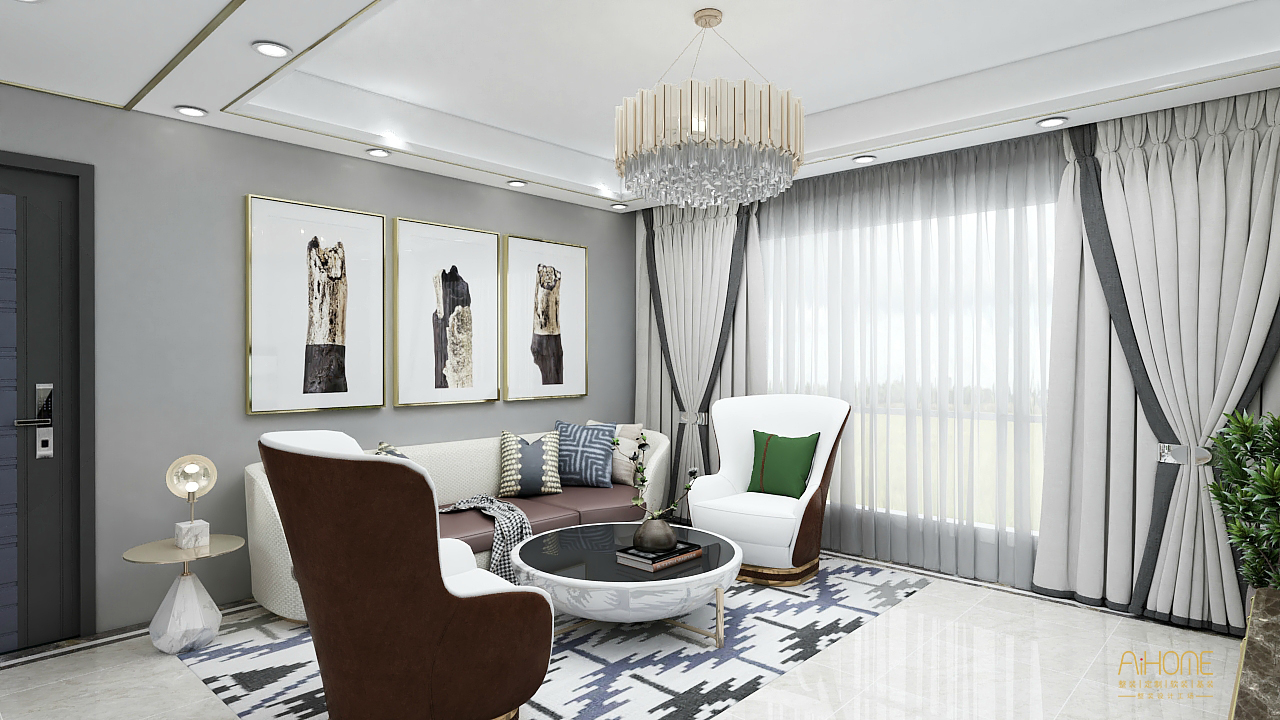 ——客廳,簡潔的小型客廳沙發,在原本不大的空間中,給人一種視野的開闊感,小面積的的深色的色塊,在簡約素雅的大空間中起著沉淀空間的作用,再加之金色勾邊的應用,透露出高貴典雅的氣質。
