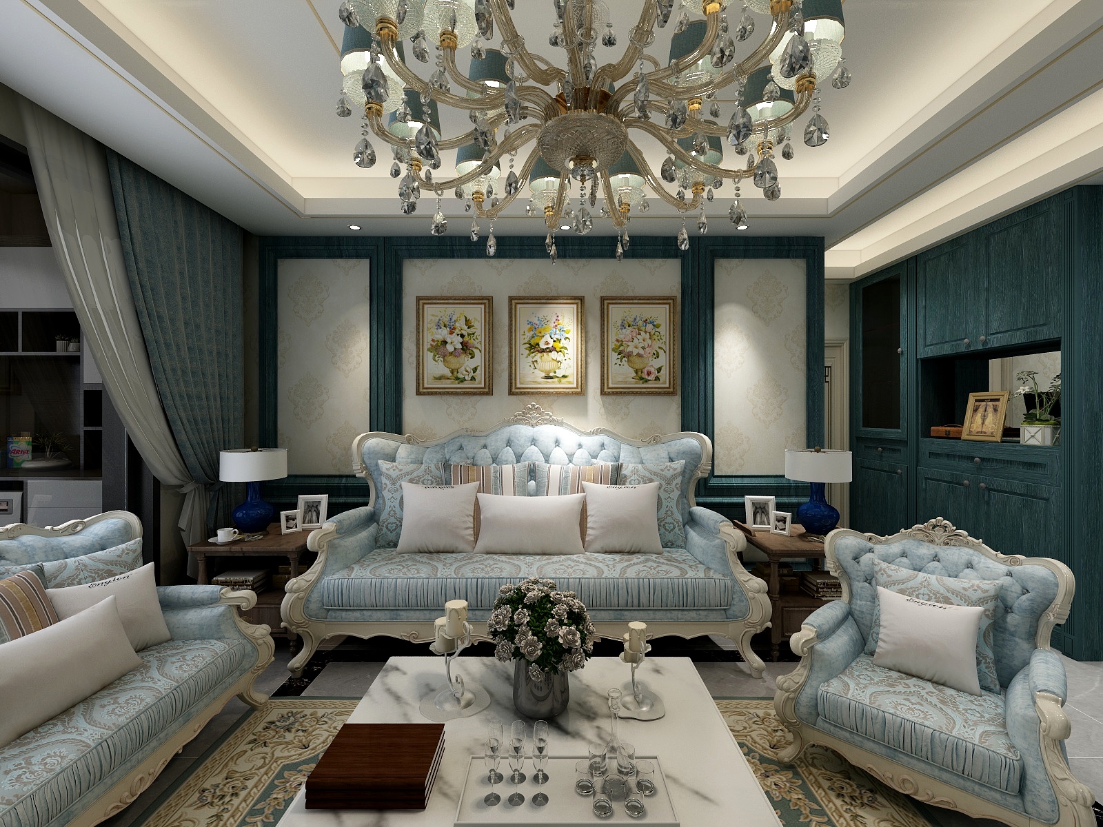 客餐廳采用歐式家具,采用與傳統的歐式不同的淺藍色家具,別有一番清新綺麗的風格。