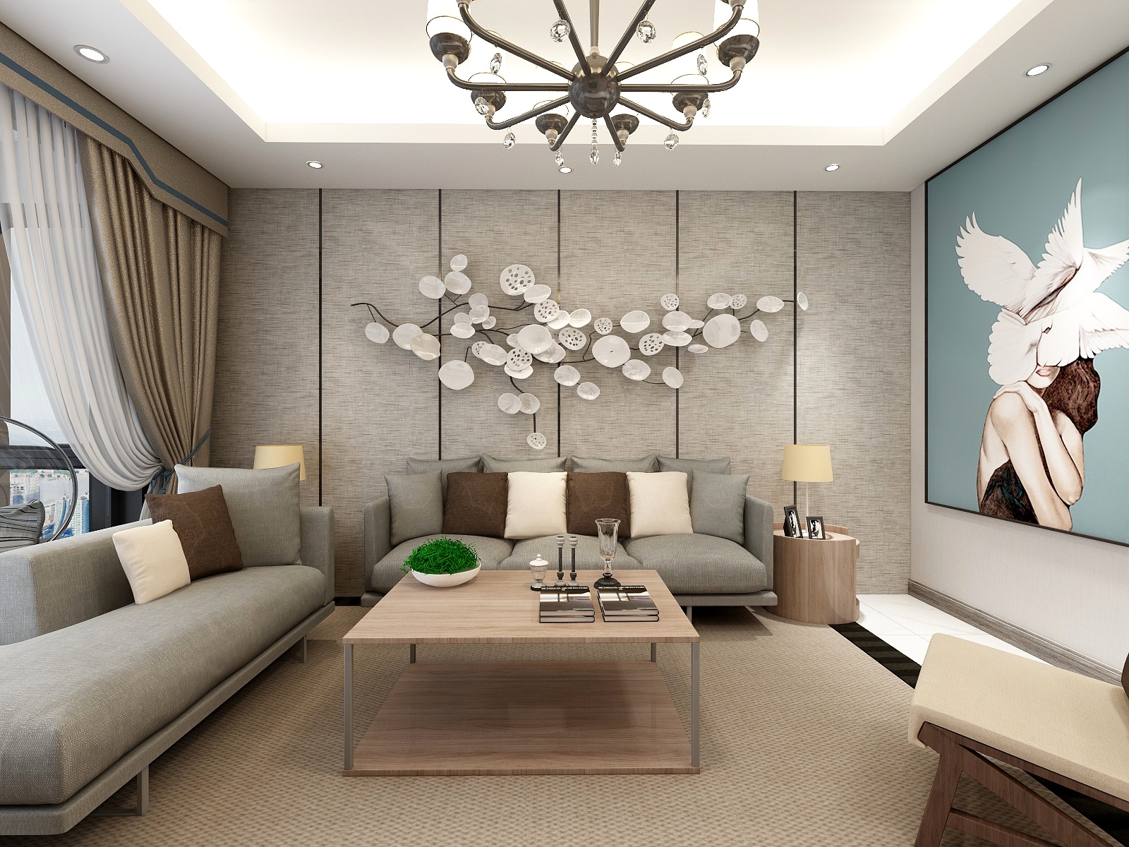——高雅的灰與白鶴少女與整體的并搭配有一種青山遠鶴的意境。客廳暖黃色的茶幾、地毯,窗簾,為空間增添溫馨之感。