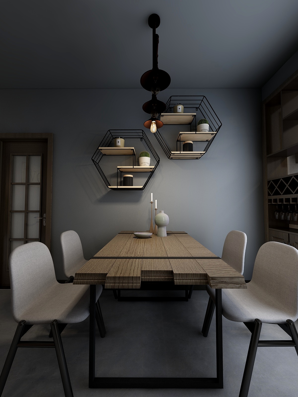 ——餐廳,沒有過多的裝飾,搭配異形的原木桌,別有一番風味。