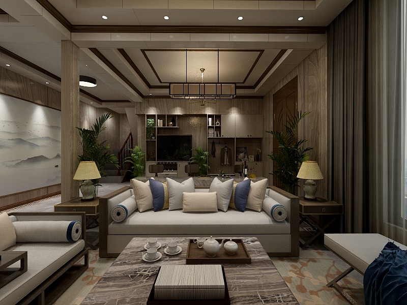 ——本案簡中式風格裝修效果圖,整體多采用淺色系木板,空間多采用線條進行空間的劃分與裝飾,客廳,簡中式家居,搭配灰白淺色軟裝飾品,更顯溫和、自然。