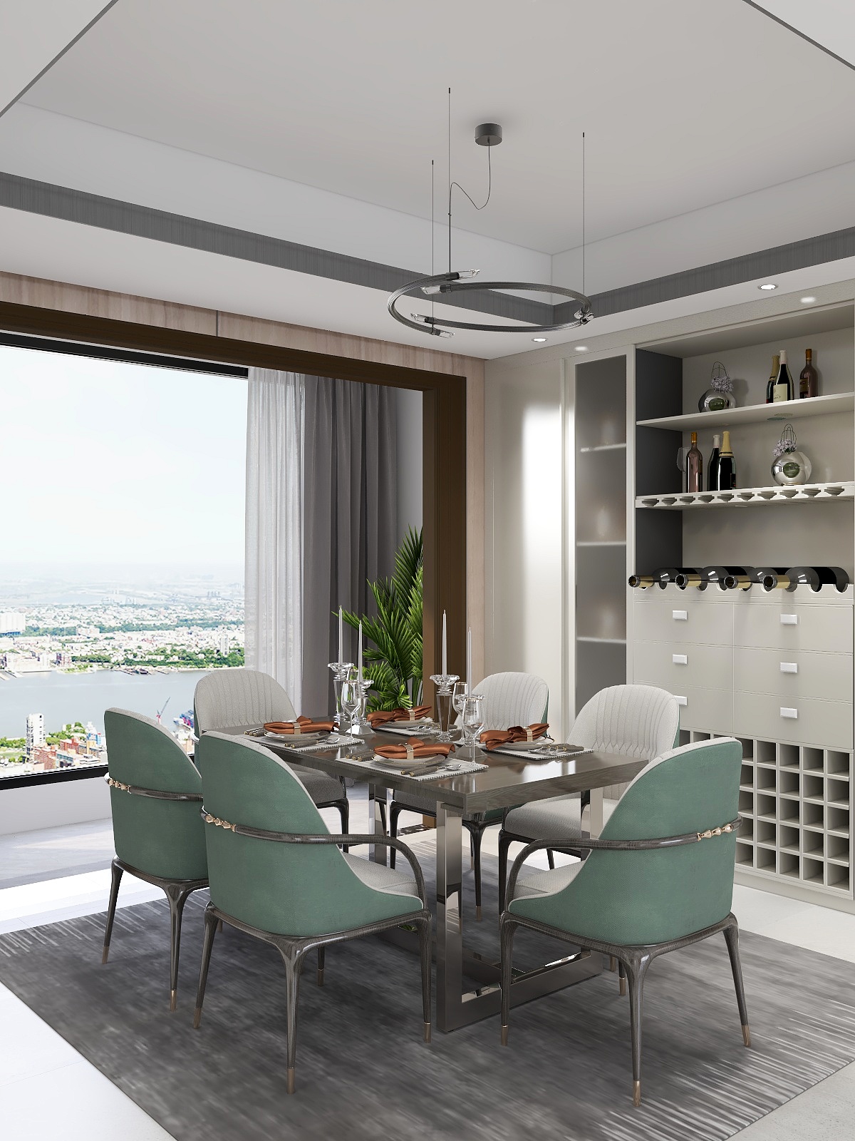 ——餐廳,整體色調與客廳統一,加入清新的薄荷綠,使人心情舒暢,光與影的應用恰到好處。