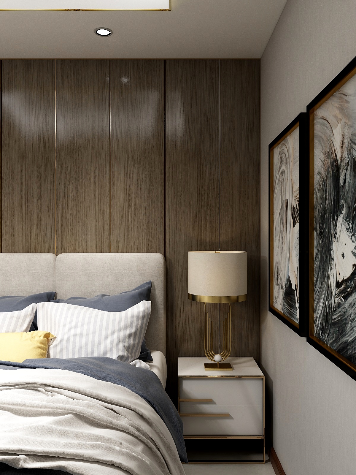 ——臥室,采用大量的棕,白色色彩,給人一種親近的感覺,當然也少不了我們修邊的金屬條的點綴,體現輕奢的情懷。