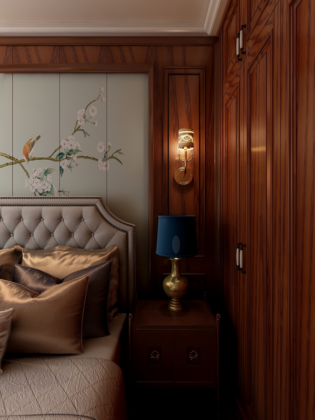 ——臥室大多采用胡桃桃木的護(hù)墻板進(jìn)行鋪貼,嵌入花鳥的寫意畫,清新而淡雅。