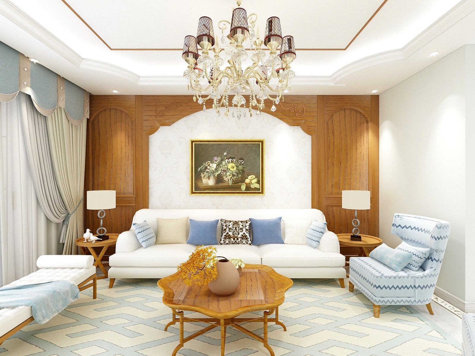 ——整體為簡約歐式,加了些許茶色琥珀色澤般的淺色橡木裝飾,與簡歐搭配具有別樣風情,客廳明亮簡白,使人感到純潔,清新藍的色調使空間變得透氣。