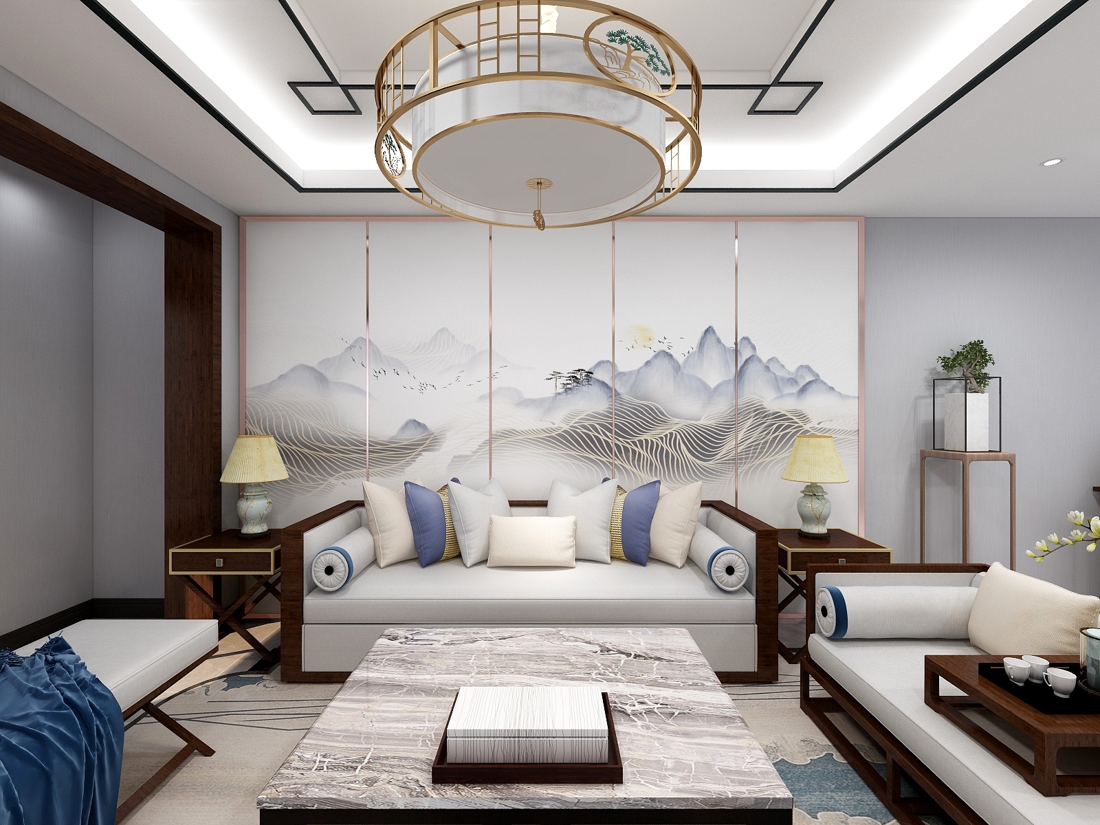——本案為新中式,不同于中式的裝修風格,它更為簡潔,線條感清晰,顏色相對來說較為低調。客廳簡潔協調,新中式山水畫的裝點,韻味更濃,玫瑰金描邊,低奢浪漫。