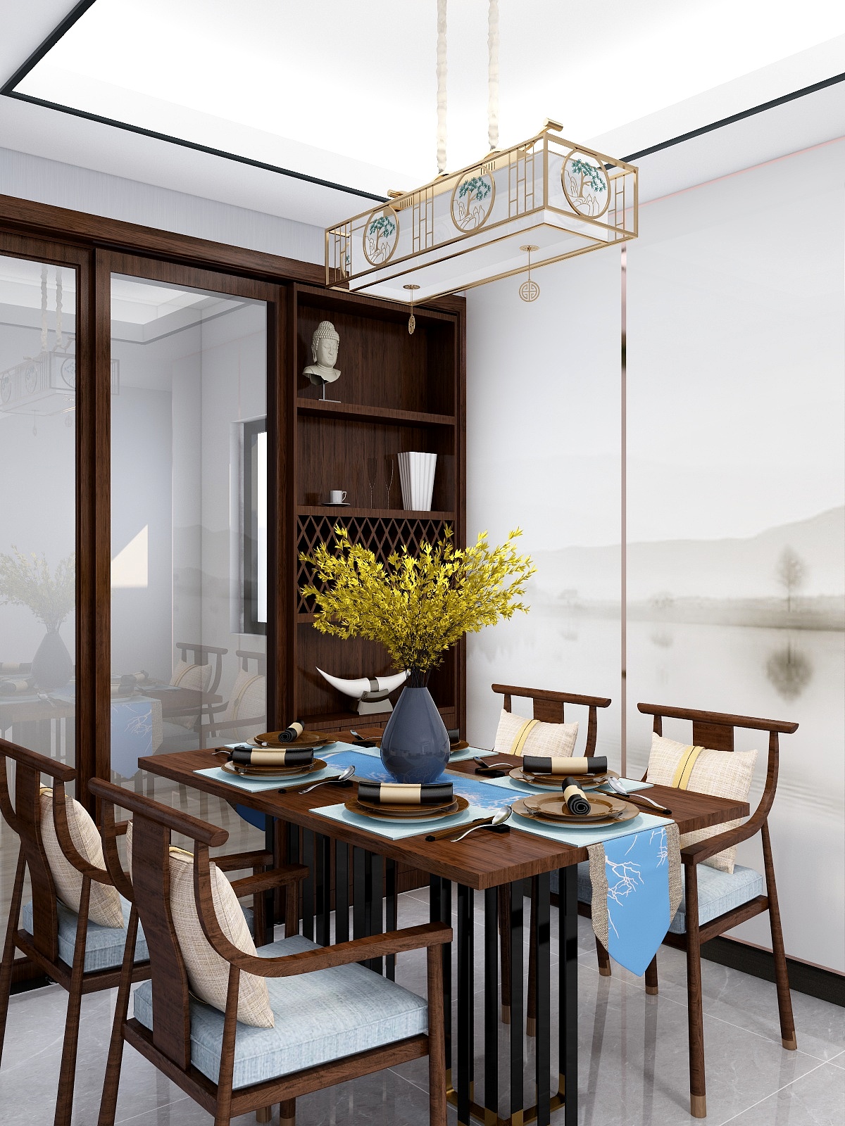 ——餐廳與客廳風格統一,金屬新中式的吊燈,與山水畫結合,精致又有韻味。