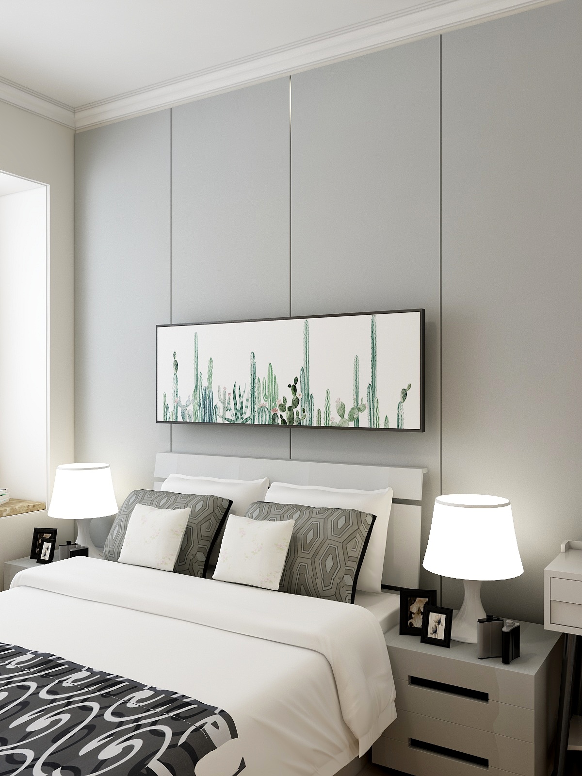 ——臥房簡潔,沒有多余的裝飾品,金屬的收邊條將背景板分割的條例清晰,像似一個立體的人兒,感性中帶著理性。