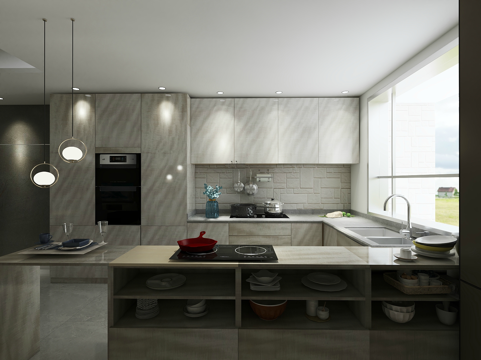 廚房以淺色的木制為主,在黑白灰的現代時尚中,可嗅出自然的質樸。